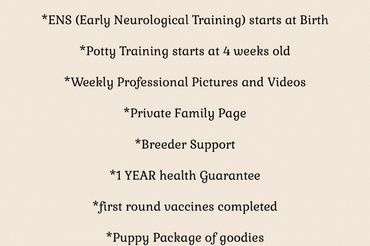 Good temperament in dogs is as important as their physical health. We use techniques from Puppy culture, ENS Early Neurological stimulation some of the tools we use to help our pups to be the best pups they can be for their families. The pups socialize with my Grandsons who live on the property also. They are loved on tremendously before they leave us. We do health-DNA test through Embark and Canine Health Check. We strive for the healthiest well rounded furbaby for you.